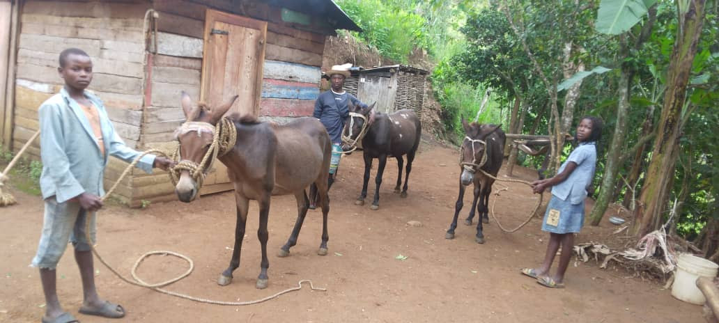 - Achat et distribution de 50 mulets, avec le suivi approprié par après, à des femmes et à des familles déplacées pour ainsi procurer des revenus à ces parsonnes défavorisées et pour appuyer le transport et la production agricole de la communauté par un moyen de transport approprié aux conditions de terrain difficiles de la région.