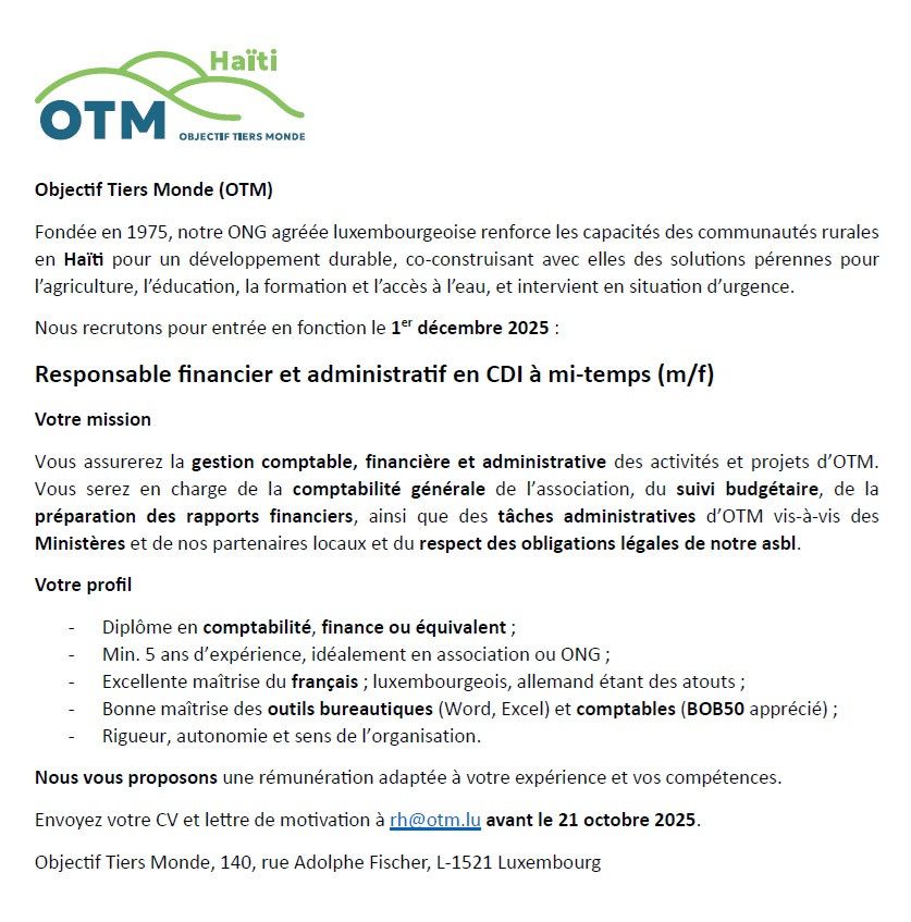 OTM recrute pour entrée le 1er décembre 2025 un RESPONSABLE FINANCIER ET ADMINISTRATIF à mi-temps.